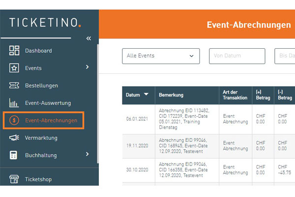 Im Menu links unter "Event-Abrechungen".