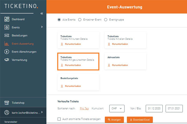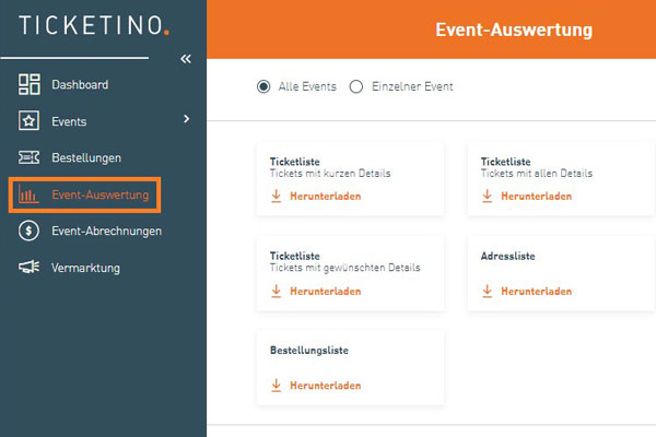 Egal ob Sie die Einlasskontrolle mit Scannern oder klassisch anhand einer Liste vornehmen: Eine ausgedruckte Ticketliste aller Bestellungen gehört zu einer optimalen Vorbereitung und dient bei Problemen als erste Anlaufstelle bzw. Informationsquelle. In dieser Liste sind nämlich alle Informationen wie Anzahl Tickets, Bezahlstatus und Gültigkeit vermerkt. Die Liste kann im Menu „Event-Auswertung“ heruntergeladen werden (Warten Sie mit dem Herunterladen, bis das Ende des Vorverkaufs erreicht ist).
